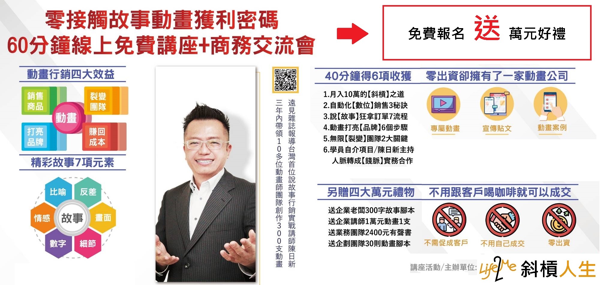 現在,馬上動動您的小手指,免費報名陳日新老師的零接觸故事動畫成交術,